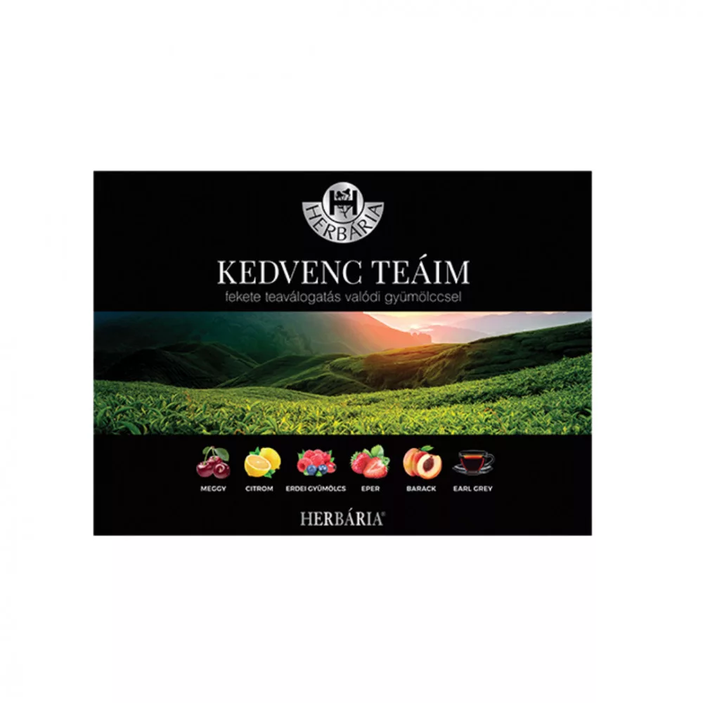 Doboz tartalma: Meggy ízű fekete tea, 5 db 1,5 g-os borítékolt filter, Citrom ízű fekete tea, 5 db 1,5 g-os borítékolt filter, Erdei gyümölcs ízű fekete tea, 5 db 1,5 g-os borítékolt filter, Eper ízű fekete tea, 5 db 1,5 g-os borítékolt filter, Őszibarack ízű fekete tea, 5 db 1,5 g-os borítékolt filter, Earl grey ízesítésű fekete tea, 5 db 1,5 g-os borítékolt filter.