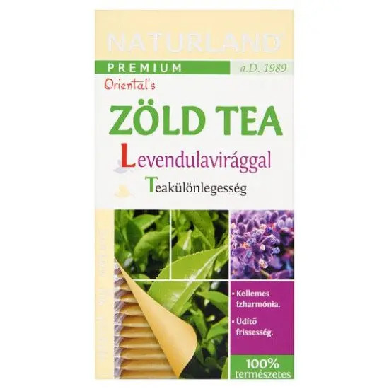 A hagyományok szerint a zöld tea leveleit nem érlelik, hanem közvetlenül a gyűjtés után megszárítják. Értékes anyagokban gazdag teáját a keleti kultúrákban rendszeresen fogyasztják. A NATURLAND különleges teakeverékével ízlelje meg a tradicionális, keleti ízvilág és a levendulavirág aromájának frissítő harmóniáját! 100%-ban természetes összetevőket tartalmaz!