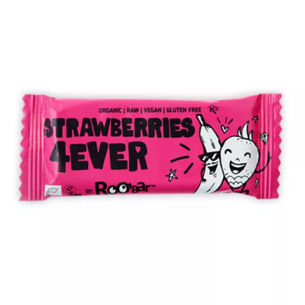 Összetevők: kesudió*, datolya*, banán*(20%), eper*(3%).\n *nyers alapanyagok, ellenőrzött ökológiai gazdálkodásból. Ellenőrizte: BG-BIO-02\nA forgalmazást ellenőrzi: Hungária Öko Garancia Kft., HU-ÖKO-02 Prémium gyümölcsszelet, 100% organikus nyers (raw) bar kiváló és izgalmas alapanyagokból. Gluténmentes alapanyagokból, laktózmentes, szójamentes, VEGÁN, paleo, KOSHER. Hozzáadott cukrot, adalékanyagot, tartósítószert NEM tartalmaz. Természetes módon előforduló cukrot tartalmaz.