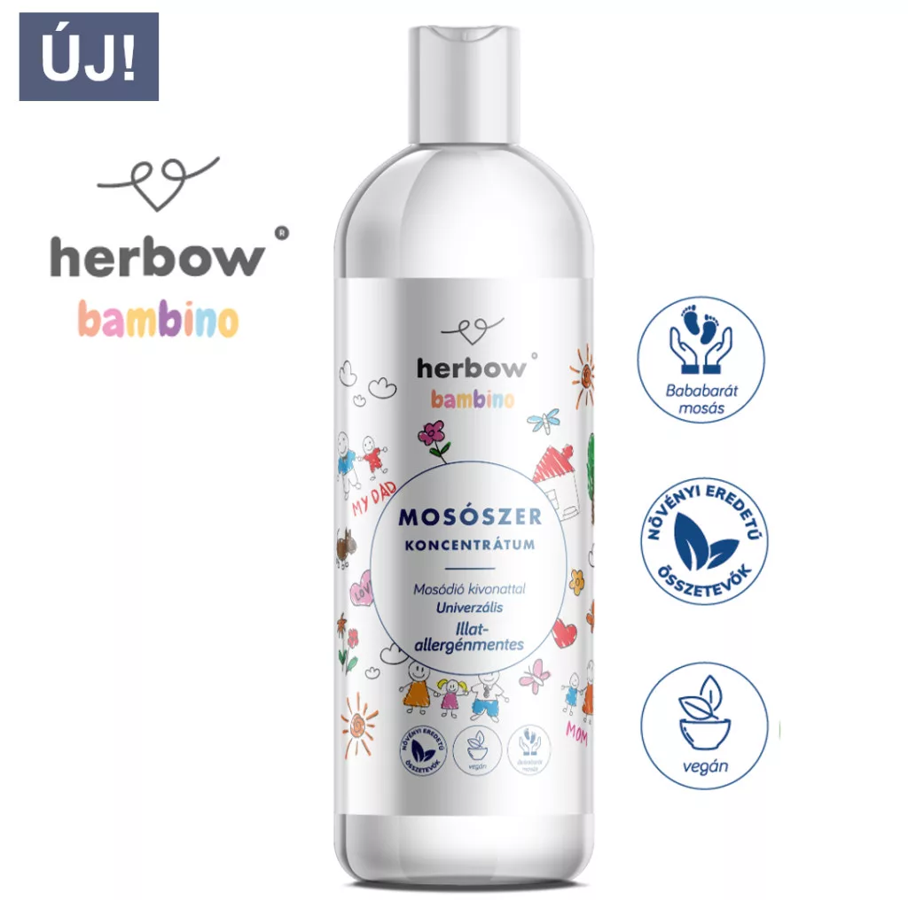 Az érzékeny bőrű és allergiára hajlamos kisbabák, gyermekek és felnőttek ruháinak tisztítására kifejezetten ajánlott Herbow bambino növényi eredetű folyékony mosószer koncentrátumaink kíméletes eljárással készült, különleges mosódió kivonatot tartalmaznak. A mosódió nemcsak a mosásban hatékony komponens, de szaponin tartalmának köszönhetően antioxidáns, antiszeptikus és gyulladáscsökkentő hatást fejt ki a bőrön, amely gátolja az irritációt. A kiváló mosóhatást a mosódió kivonat és a hozzáadott bioenzimek, növényi eredetű tenzidek és ásványi eredetű anyagok együttesen biztosítják. Bőr és környezetkímélő módon, de mégis hatékonyan varázsolja ragyogóan tisztává és puhává a ruhákat, miközben óvja a szöveteket a károsodástól és kifakulástól. Már alacsony mosási hőfokon is kifejti hatását, így energiát is megspórolhatunk vele. Minden típusú mosógéphez és kézi mosáshoz egyaránt ajánljuk.